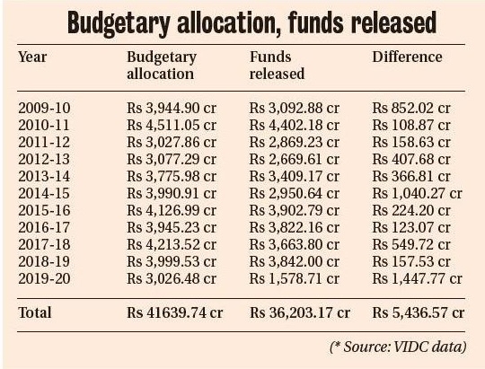 मुख्य कारणांपैकी एक म्हणजे बजेटच्या वाटपापेक्षा निधी जाहीर करणे कमी होते. विशेषत: गेल्या 11 वर्षांत ही घटना आहे. अधिकृत आकडेवारीनुसार, व्हीआयडीसीला 2009-10 च्या अर्थसंकल्पात 852.02 कोटी रुपये कमी मिळाले. त्यावर्षी व्हीआयडीसीसाठी बजेटचे वाटप 3,944.90 कोटी रुपये होते परंतु सरकारने त्यास केवळ 3,092.88 कोटी रुपये दिले. 2019-20 पर्यंत दर वर्षी हीच पुनरावृत्ती होते, जेव्हा व्हीआयडीसीला अर्थसंकल्पित वाटपापेक्षा 1,447.77 कोटी कमी मिळाले. या 11 वर्षात, त्याच्या बरोबरच्या चार्टमध्ये, व्हीआयडीसीला अर्थसंकल्पित वाटपापेक्षा एकूण 5,436.57 कोटी रुपये कमी मिळाले.